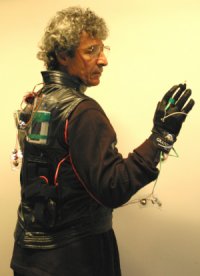 Displaying video footage from a project using the first wearable suit developed with Wei Yei, entitled The Automated Body Project, Yacov featured the cyber-suit: "It collected data from the wearer, including EEG information, talked to a "mothership" and returned, via radio-frequency communications, an image representing the data. You could move your eyes and the image would move, or extend an arm and the image would extend - the images were projected on a transparent screen. A dataglove also let me manipulate that material in real-time." The first iteration of the cyber-suit featured a large, rigid control pack on the front, and Sharir and Yei set about shrinking as much of its electronics into the actual suit as possible. Sharir demonstrated the second version of the suit operating in a performance entitled Lullaby: "For me, it was the first time I could create a situation with a slight relationship between a human and a cyber-human. By wearing the suit, I could activate different types of movements or phrases." According to the designer, the Cyberprint suit is conceived to measure body responses. : "We were interested in creating an alternative to a motion-capture suit, able to control a cyber-character from a distance wirelessly." (Sharir)